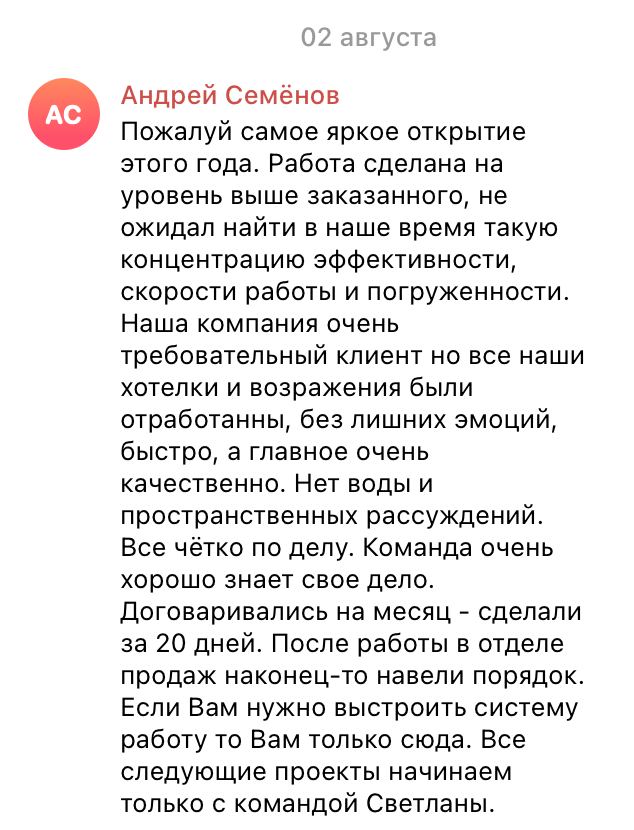 "Пожалуй самое яркое открытие этого года. Работа сделана на уровень выше заказанного, не ожидал найти в наше время такую концентрацию эффективности, скорости работы и погруженности. Наша компания очень требовательный клиент но все наши хотелки и возражения были отработанны, без лишних эмоций, быстро, а главное очень качественно. Нет воды и пространственных рассуждений. Все чётко по делу. Команда очень хорошо знает свое дело. Договаривались на месяц - сделали за 20 дней. После работы в отделе продаж наконец-то навели порядок. Если Вам нужно выстроить систему работу то Вам только сюда. Все следующие проекты начинаем только с командой Светланы."