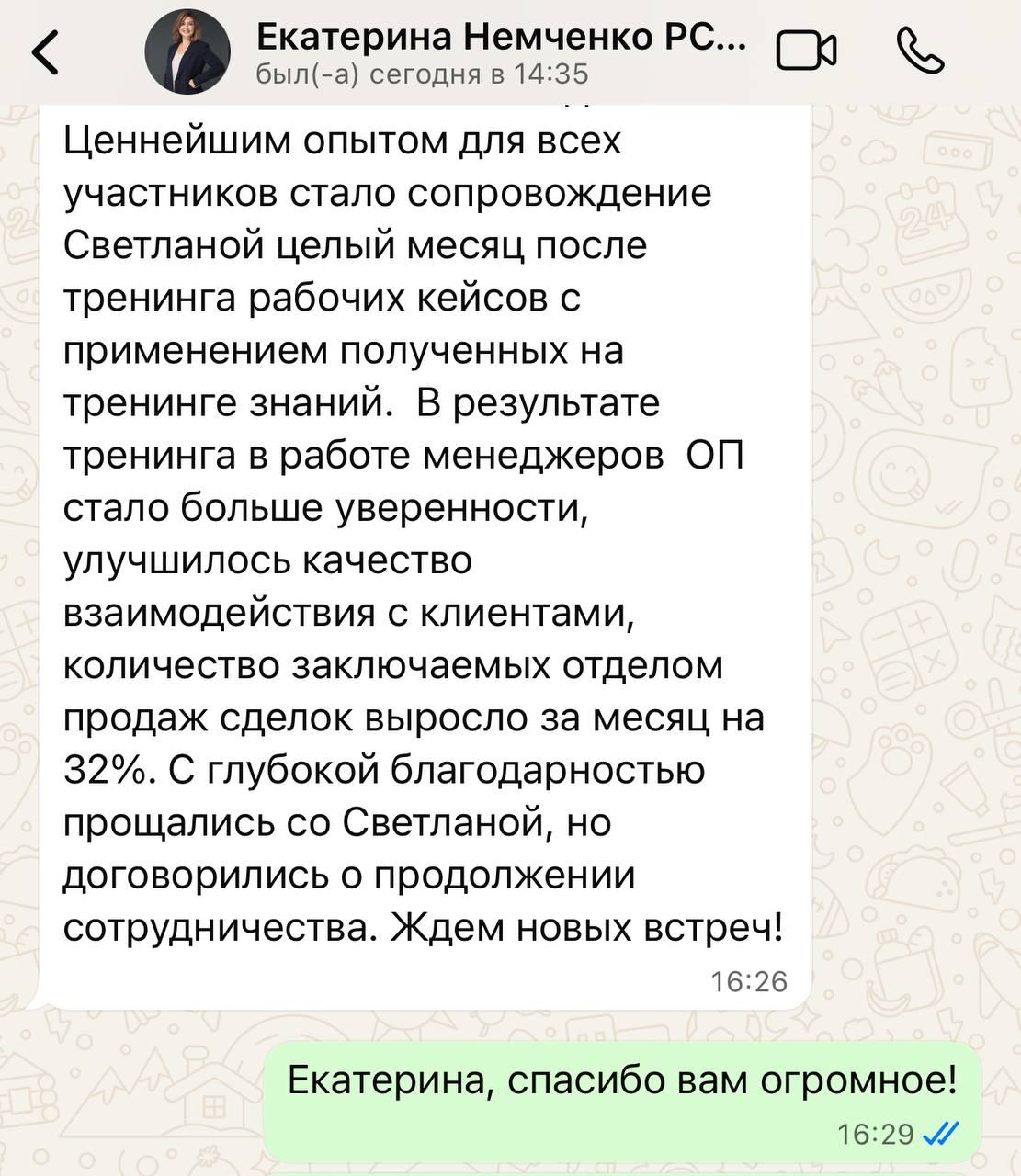 «Меняется рынок, меняется портрет покупателя, меняются условия, приоритеты. Как в этом быстро меняющемся потоке определить точки развития отдела продаж, отказаться от устаревшего, того, что тормозит и при этом сохранить свои сильные стороны, настроиться на одну командную волну, сохранив индивидуальность каждого ее члена? Требуется глубокая экспертность, знание изнутри и рынка и девелопмента, лидерские качества, умение быстро анализировать, ставить диагноз и находить решение для проблемных зон. Светлана великолепно справилась со всеми поставленными задачами, команда продавцов получила не просто теоретические знания, а то, что проверено и работает на практике, все участники тренинга были активно вовлечены в работу, работая самостоятельно и в команде. Ценнейшим опытом для всех участников стало сопровождение Светланой целый месяц после тренинга рабочих кейсов с применением полученных на тренинге знаний. В результате тренинга в работе менеджеров ОП стало больше уверенности, улучшилось качество взаимодействия с клиентами, количество заключаемых отделом продаж сделок выросло за месяц на 32%»